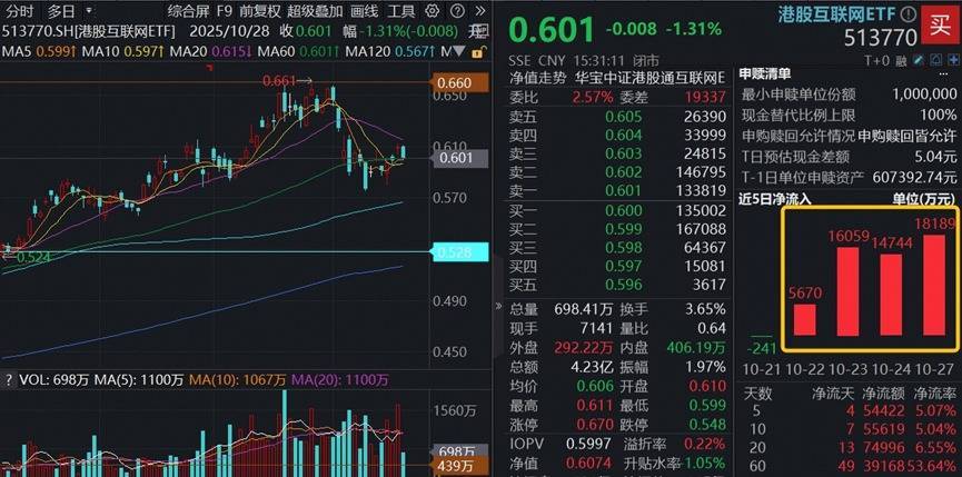百亿核心ETF——港股互联网ETF(513770)早盘围绕水面附近窄幅震荡,午后明显下行,场内价格收跌1.31%,退守60日线,全天成交额4.23亿元。资金近日明显增仓,上交所数据显示,港股互联网ETF(513770)连续4日吸金合计5.47亿元。