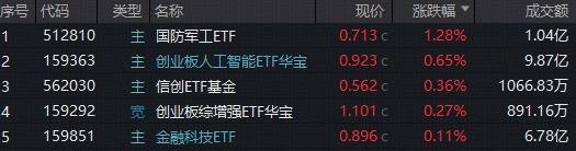 市场热点快速轮动,重仓光模块龙头的创业板人工智能ETF(159363)早盘场内一度涨超3%领涨全市场,午后仍逆市收涨迭创新高,资金净申购2800万份!国防军工久违爆发,高人气国防军工ETF(512810)场内涨逾1%居全市场TOP5!国产软件异动拉升,信创ETF基金(562030)、金融科技ETF(159851)逆市收涨。