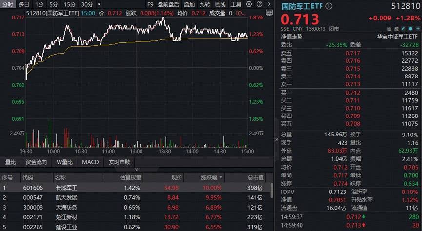 行业代表性国防军工ETF(512810)盘中上探1.85%,场内收涨1.28%,在全市场1331只上市ETF中跻身TOP5!全天放量成交1.04亿元。